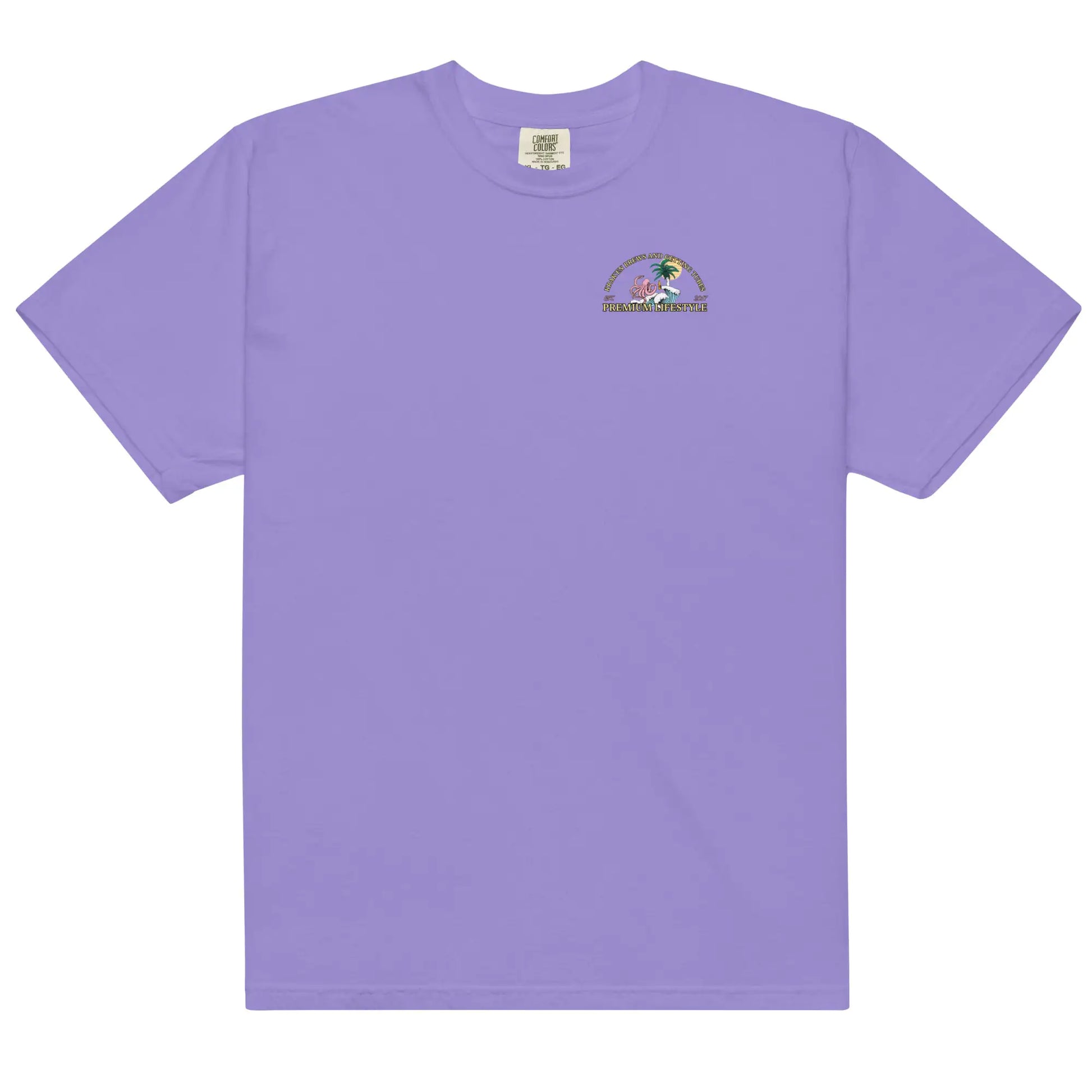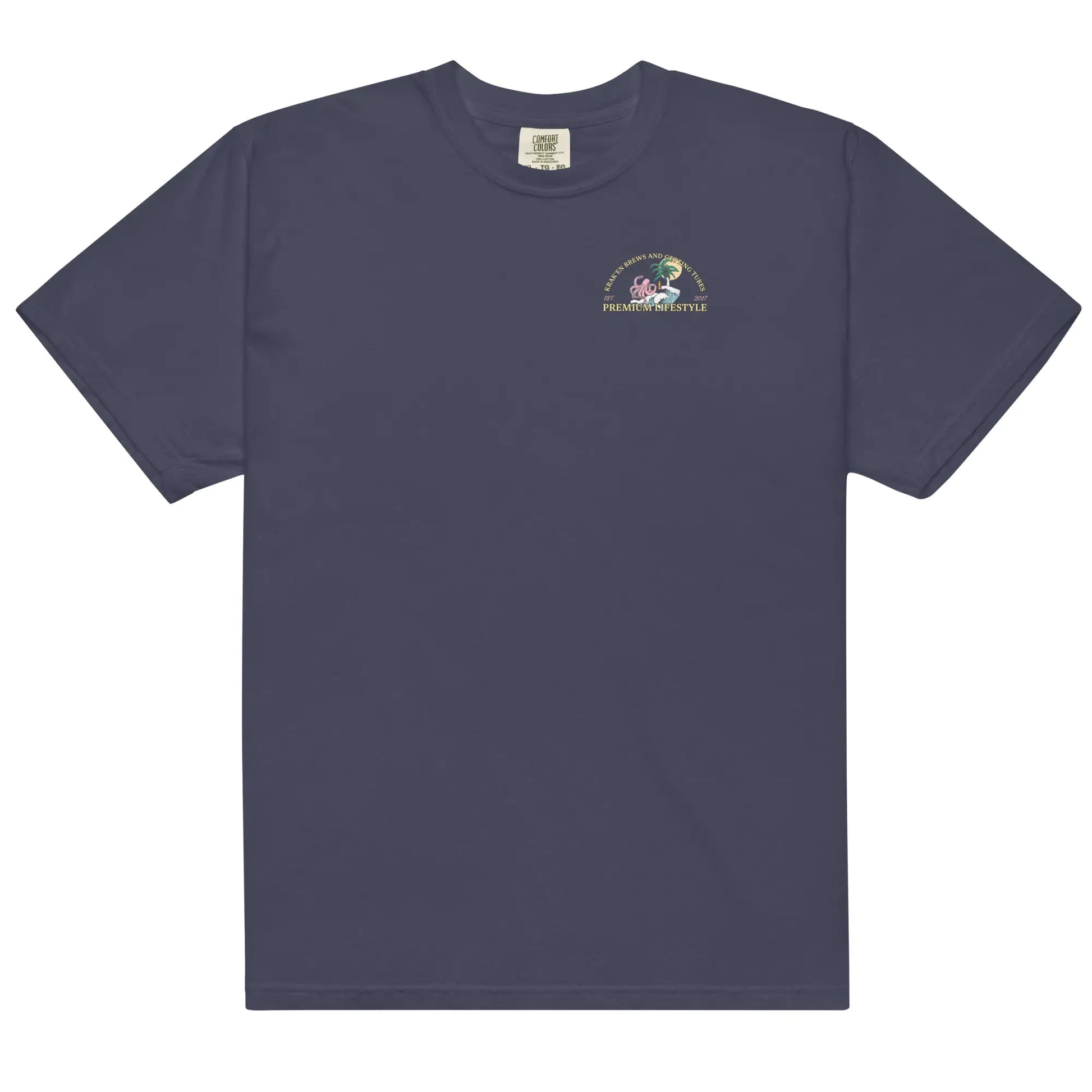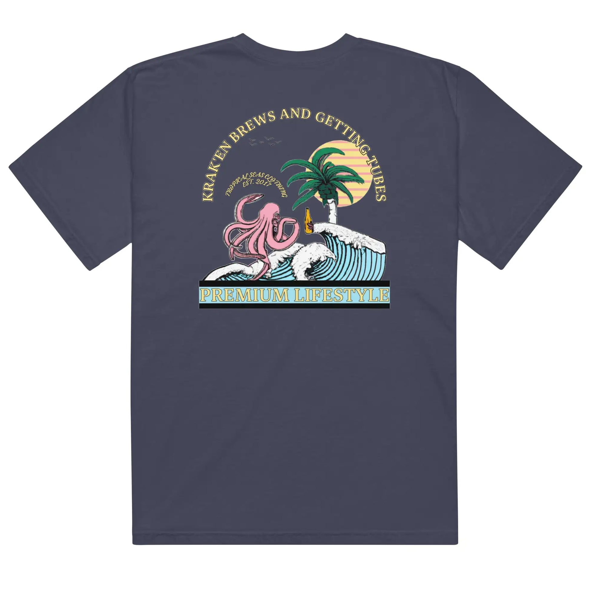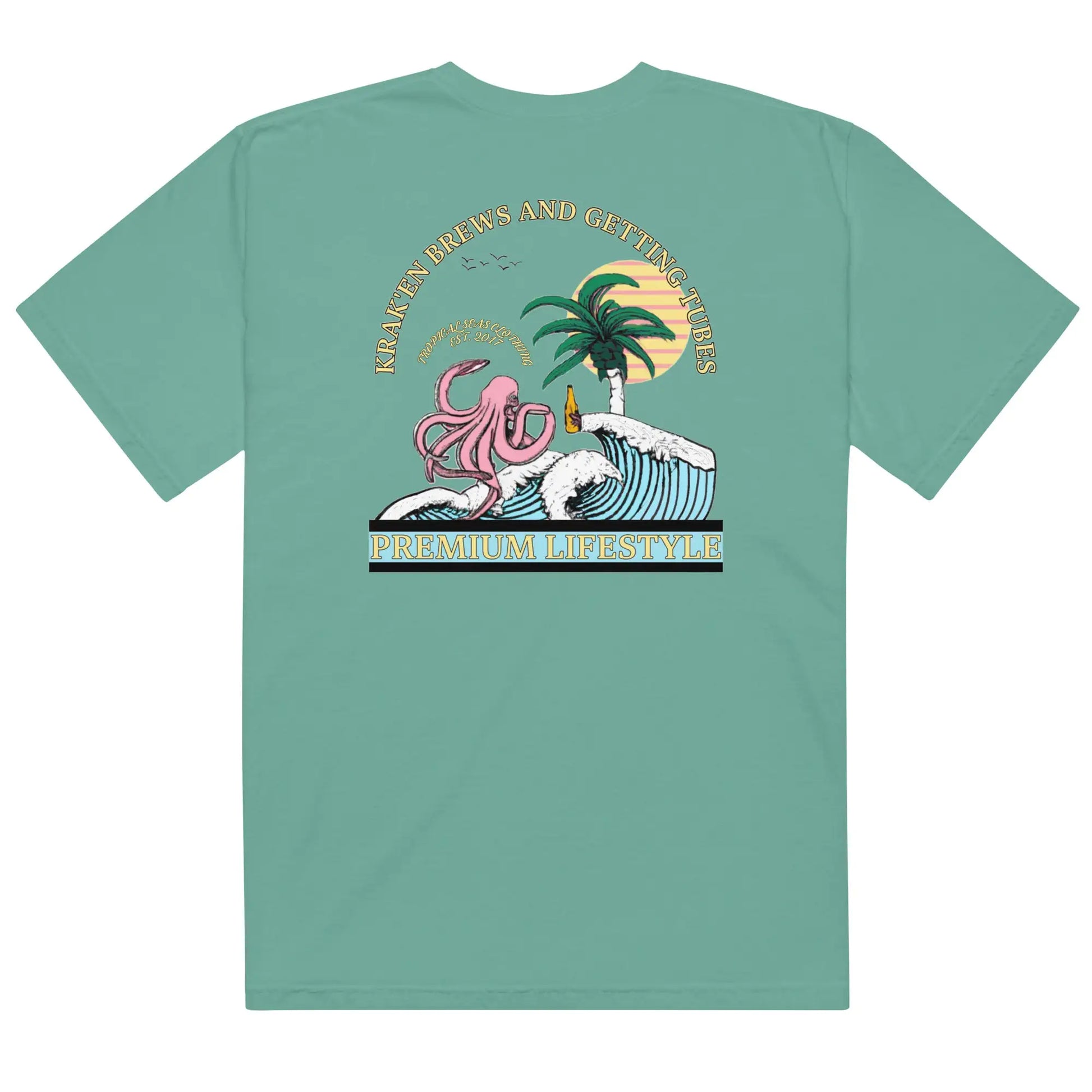 Introducing Tropical Seas Clothing's Men's Premium Lifestyle heavyweight t-shirt, featuring a bold image of a Kraken enjoying a beer with some gnarly ocean tubes. Made with high-quality materials, this t-shirt is perfect for the beach or the boardwalk. With its comfortable fit and unique design, it's sure to turn heads. Made for ocean lovers, this t-shirt is a must-have addition to any wardrobe. Get yours today and show off your love for the sea!