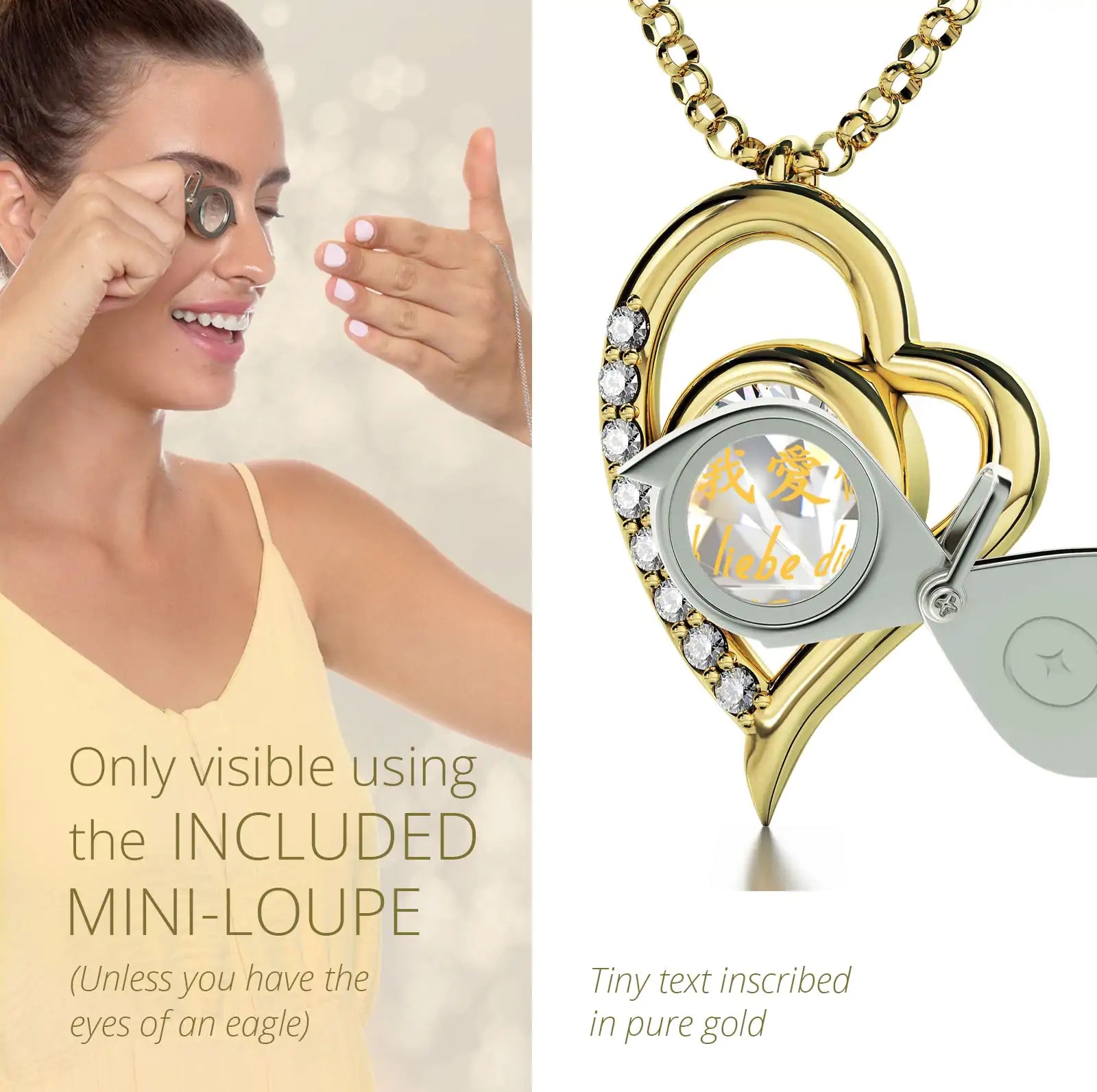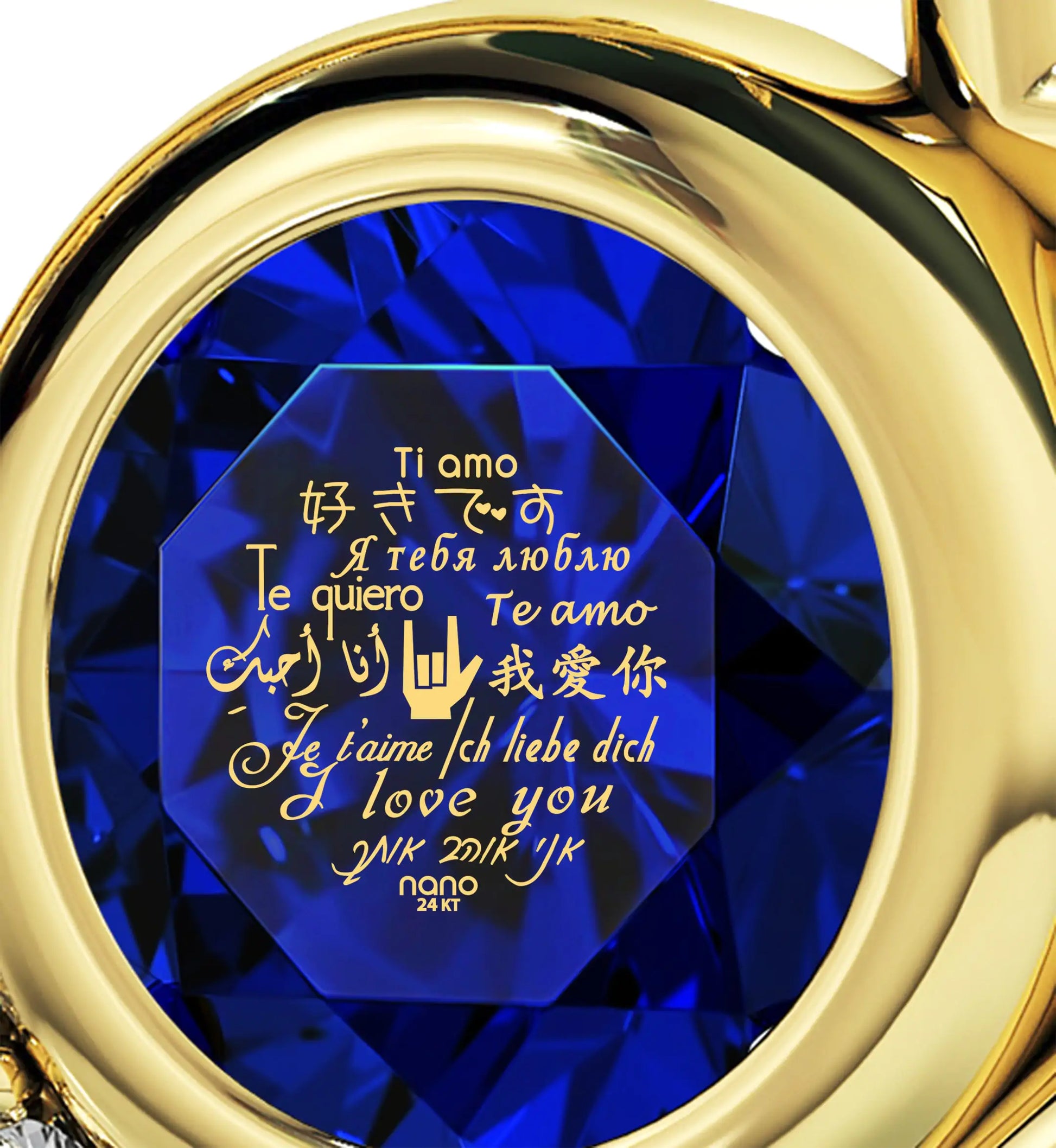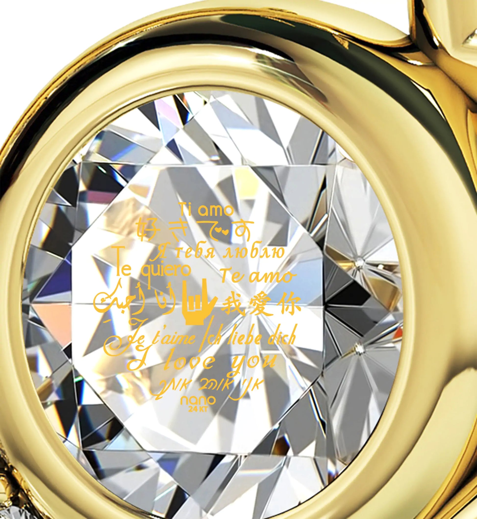 Discover the elegance of the Multilingual Love Heart Pendant Necklace, featuring a brilliant-cut Swarovski crystal engraved in 24k gold with 'I love you' in 12 languages. This luxurious heart pendant is adorned with 8 sparkling cubic zirconia stones.