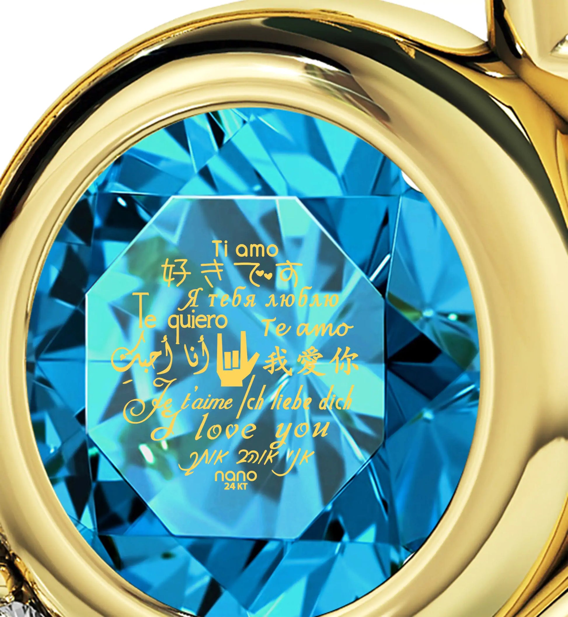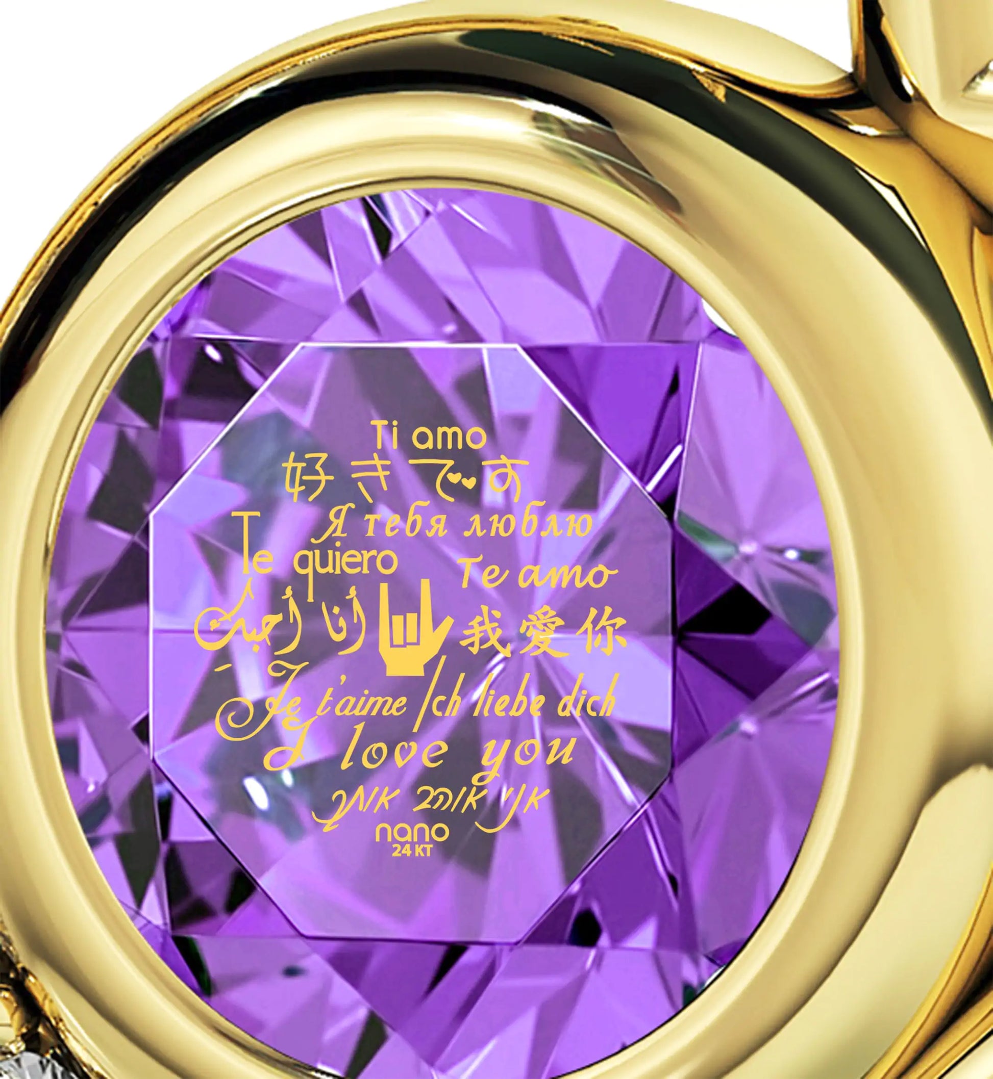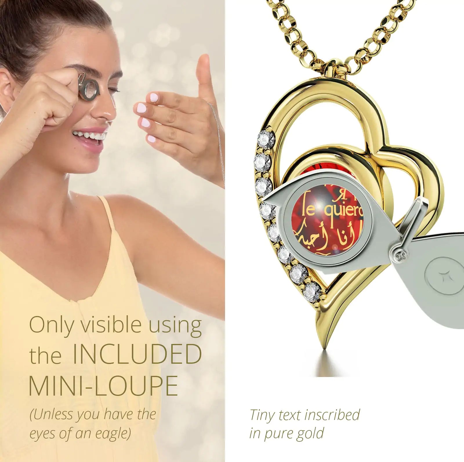 Discover the elegance of the Multilingual Love Heart Pendant Necklace, featuring a brilliant-cut Swarovski crystal engraved in 24k gold with 'I love you' in 12 languages. This luxurious heart pendant is adorned with 8 sparkling cubic zirconia stones.