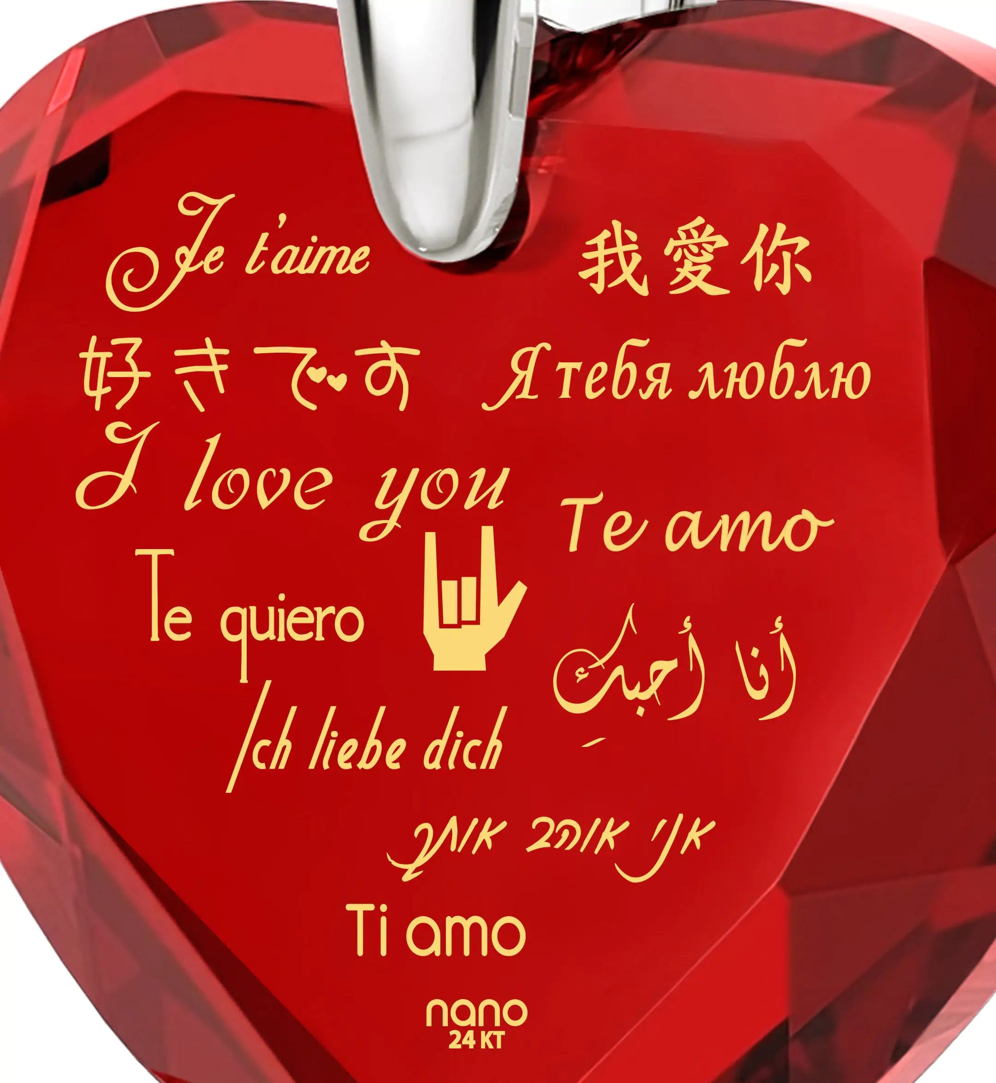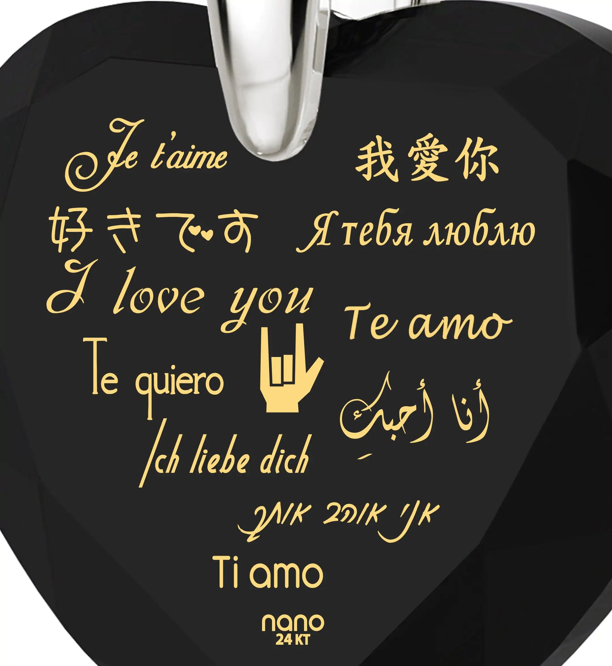 Multilingual Love Necklace and Crystal Heart Earrings Set