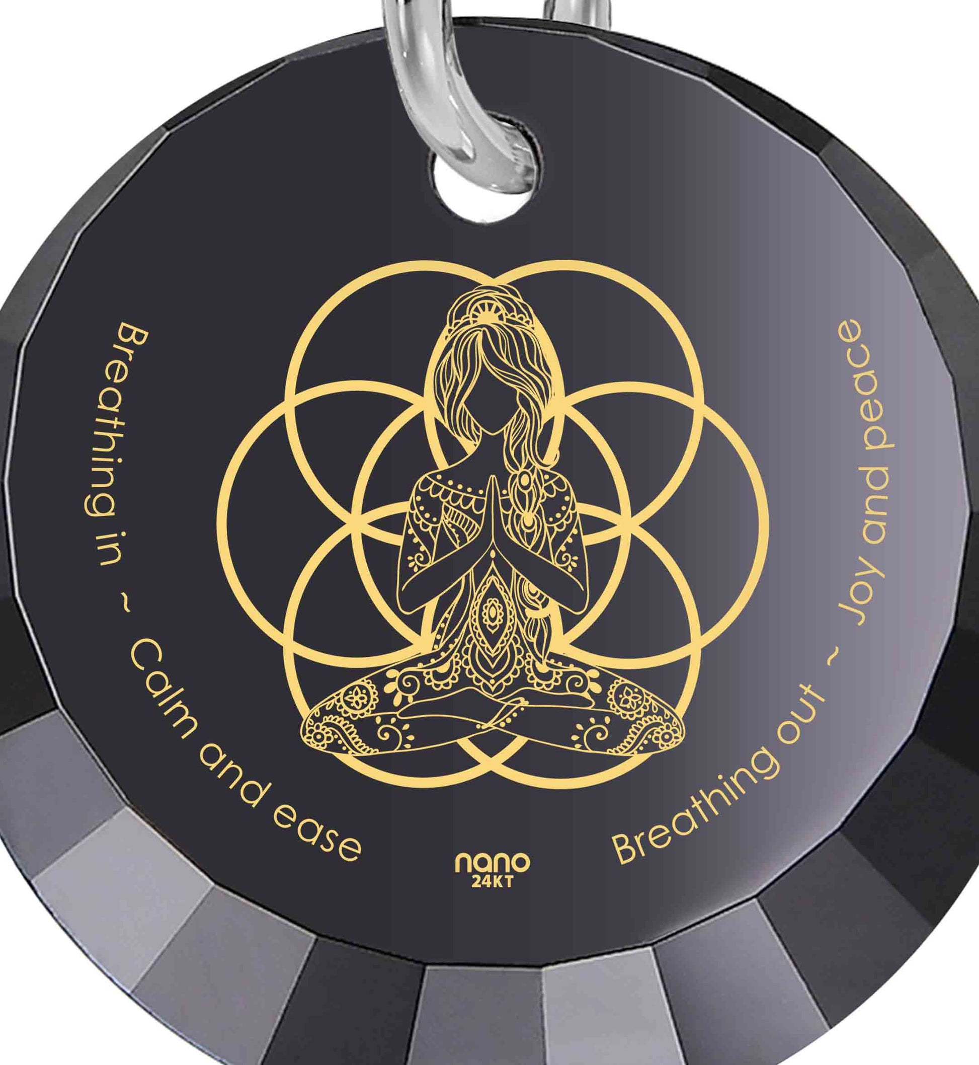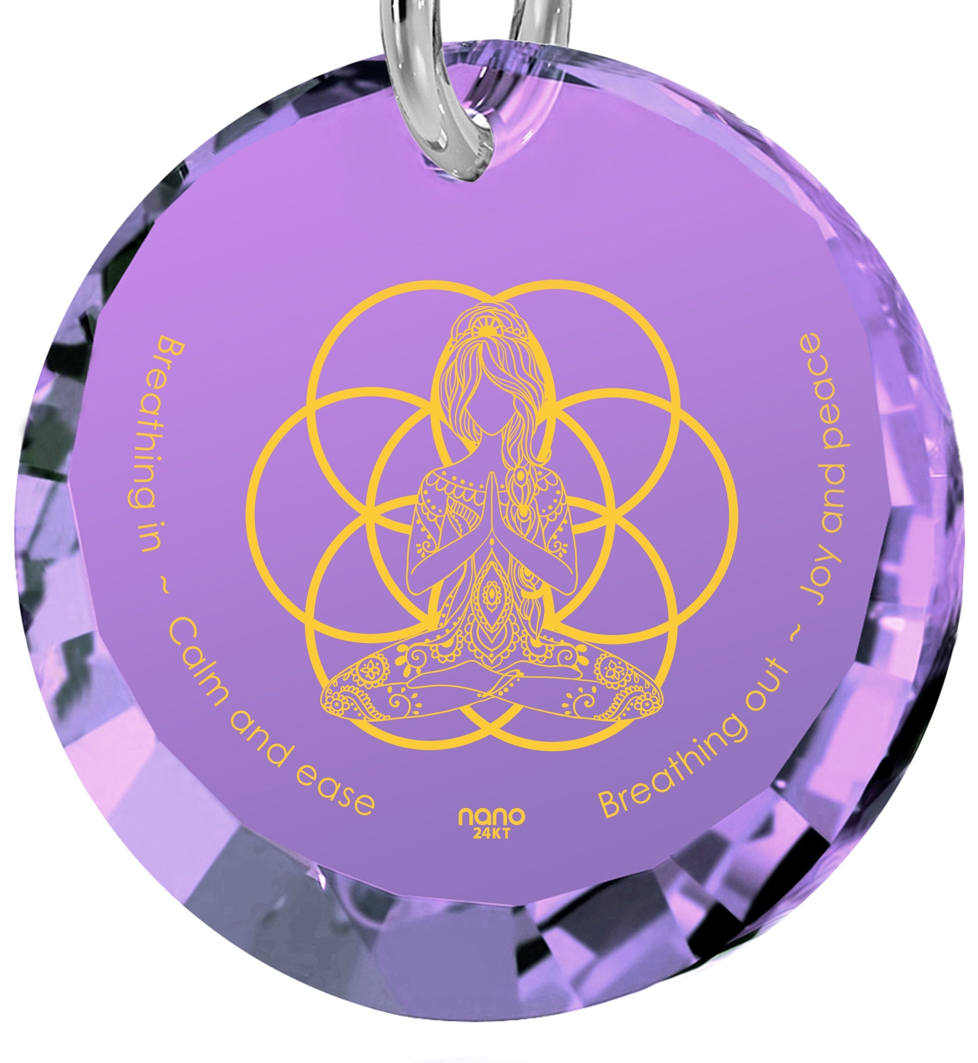 Explore inner tranquility and balance with the Seed of Life Necklace, beautifully embodying spirituality and mindfulness. This elegant necklace features the mantra 'Breathing in - calm and ease, Breathing out - love and peace,' delicately inscribed in 24k gold on a cubic zirconia gemstone. 🧘♂️
